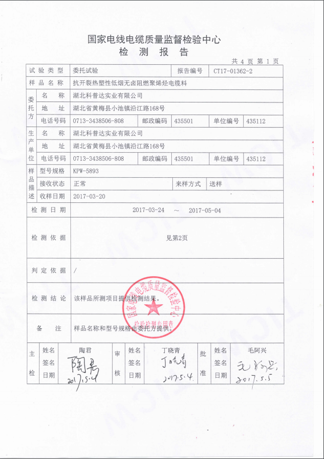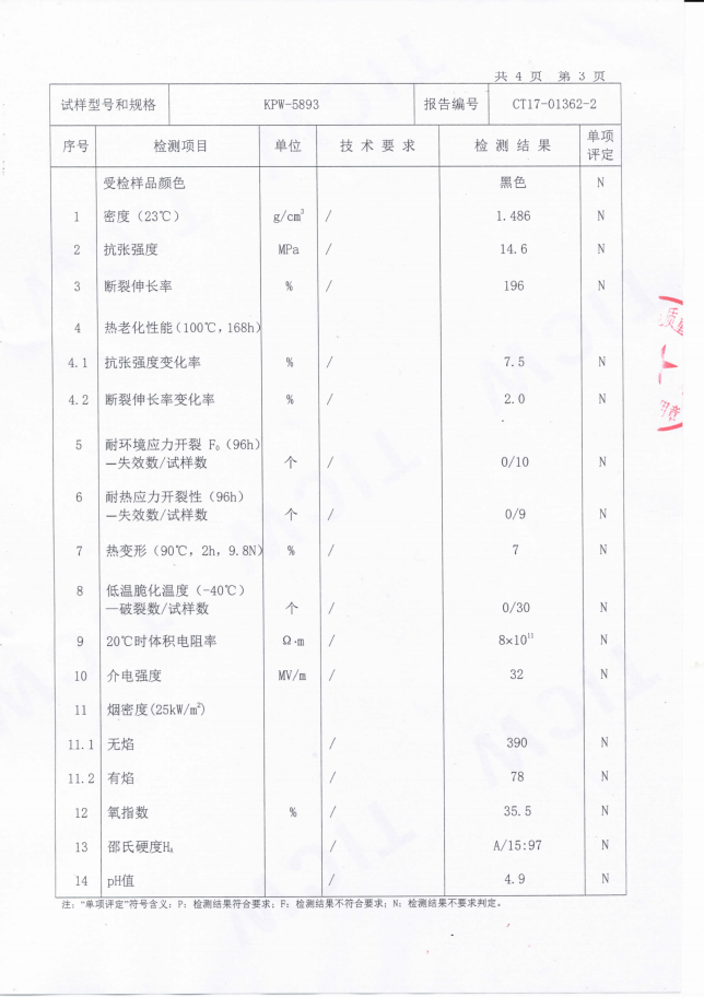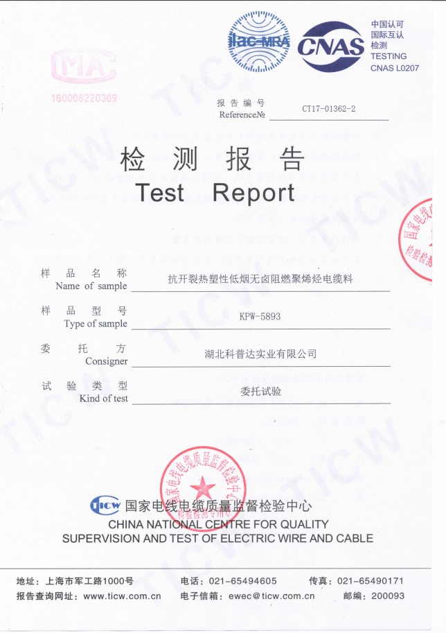 KPW-5893抗開裂熱塑性低煙無鹵阻燃聚烯烴電纜料檢測(cè)報(bào)告